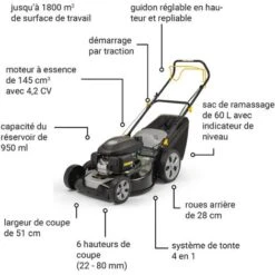 Un indicateur de remplissage pratique évite le risque de colmatage de la goulotte d’éjection en vous prévenant avant que le bac ne soit plein. Sa transmission tractée vous permet quant à elle de tondre sur des parcelles en pente ou couvertes d’herbes hautes sans effort.