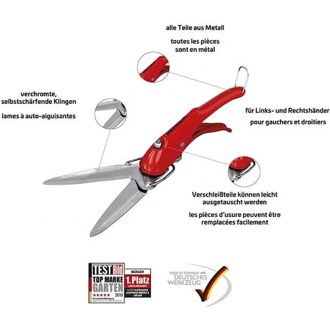 Ciseaux de gazon BERGER 2100 entièrement métallique avec des lames auto-afilables chromées pour la coupe parfaite des bords de pelouse et des zones d’accès difficile dans les clôtures ou les murs. L’outil professionnel fabriqué en Allemagne permet une prise en main ferme, un travail lisse et confortable et est adapté à gauche et à droite.