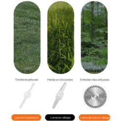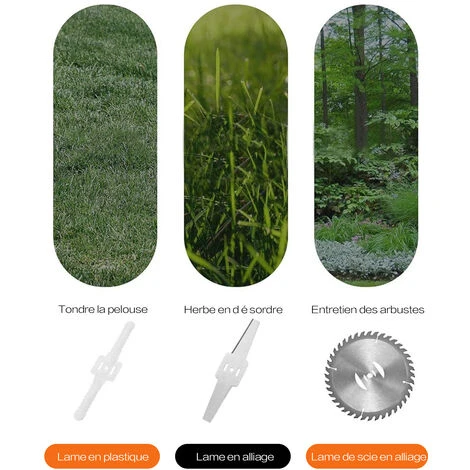 Les lames en plastique conviennent à une herbe molle tondeuse, les lames métalliques en acier inoxydable conviennent aux pelouses de tonte, aux mauvaises herbes et aux petits arbustes, les lames de scie circulaire en acier de manganèse sont des branches d’arbustes plus épaisses plus épaisses, faciles à nettoyer et non rouillées.