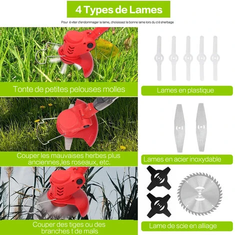 Les lames en plastique conviennent à une herbe molle tondeuse, les lames métalliques en acier inoxydable conviennent aux pelouses de tonte, aux mauvaises herbes et aux petits arbustes, les lames de scie circulaire en acier de manganèse sont des branches d’arbustes plus épaisses plus épaisses, faciles à nettoyer et non rouillées.
