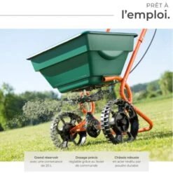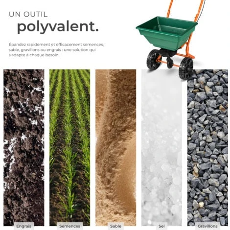 - Convient pour les semences, l’engrais, le sable, le sel de déneigement et le gravier.