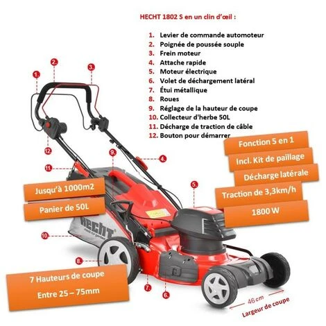 Hecht 1802 S Tondeuse à gazon électrique 5en1 1800W largeur coupe 46cm bac 50L 7hauteur de coupe 25-75mm