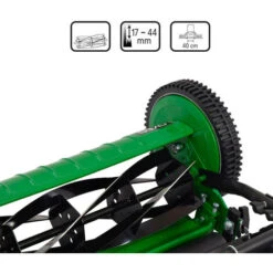 Elle est dotée d’un système de lames hélicoïdales soudé sur un tambour en acier qui est sur roulement. Les cinq lames coupent sur la contre lames de manière nette l’herbe. À la différence d’une tondeuse à moteur qui coupe l’herbe en la fouettant. La coupe étant nette, la santé de votre gazon est parfaite. En fonction de l’état de votre pelouse, la hauteur de coupe peut se régler de 17 à 44mm.
