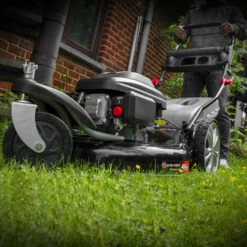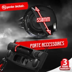 Elle est équipée d’un carter en acier permettant une largeur de travail de 55cm, d’un bac de récolte de 65L, d’un réglage de coupe centralisé ( 6 positions de 25 à 75mm), d’une éjection latérale et de la fonction mulching.
